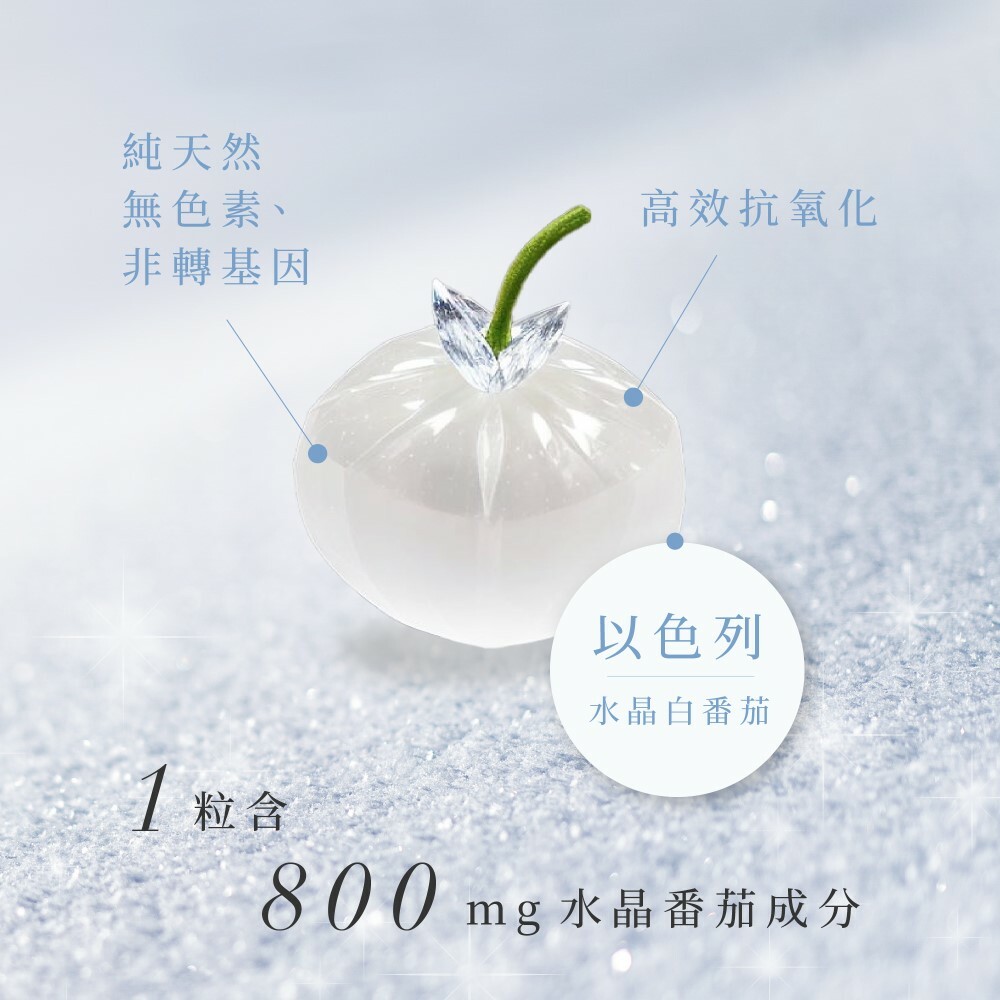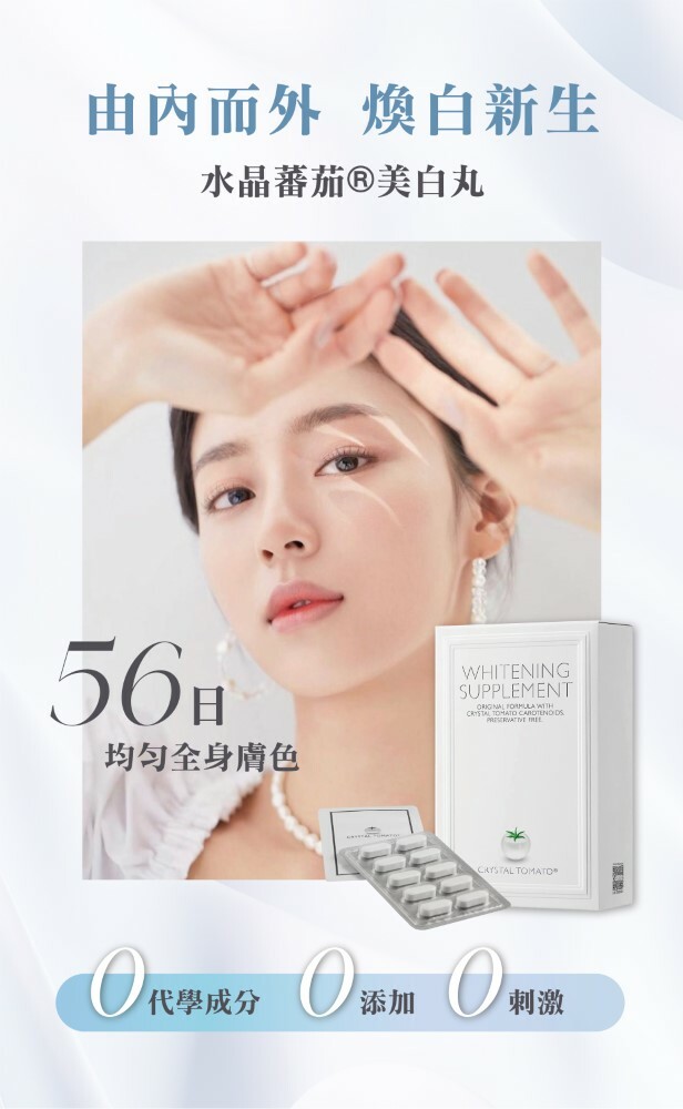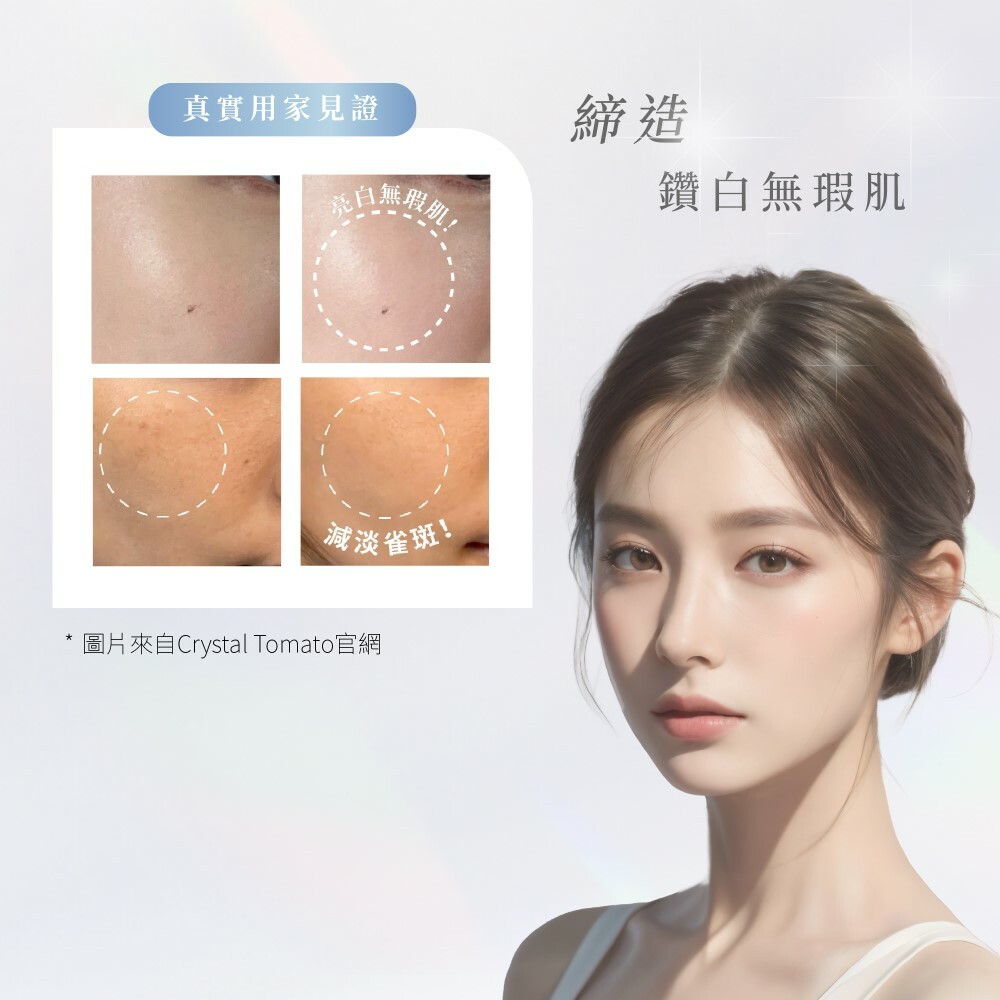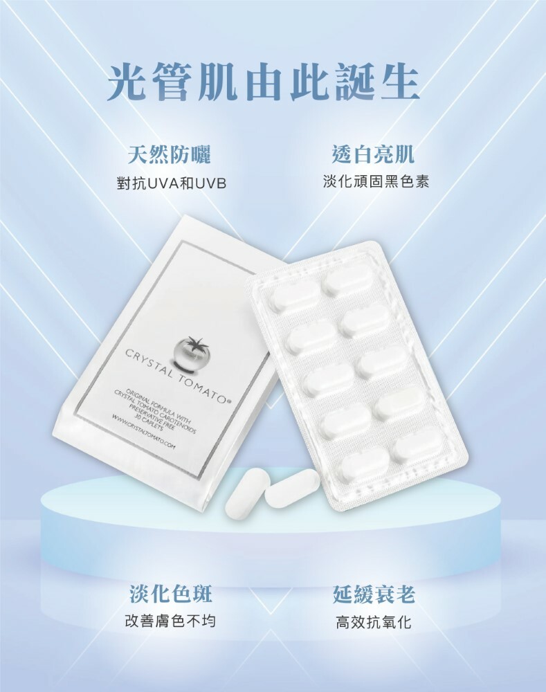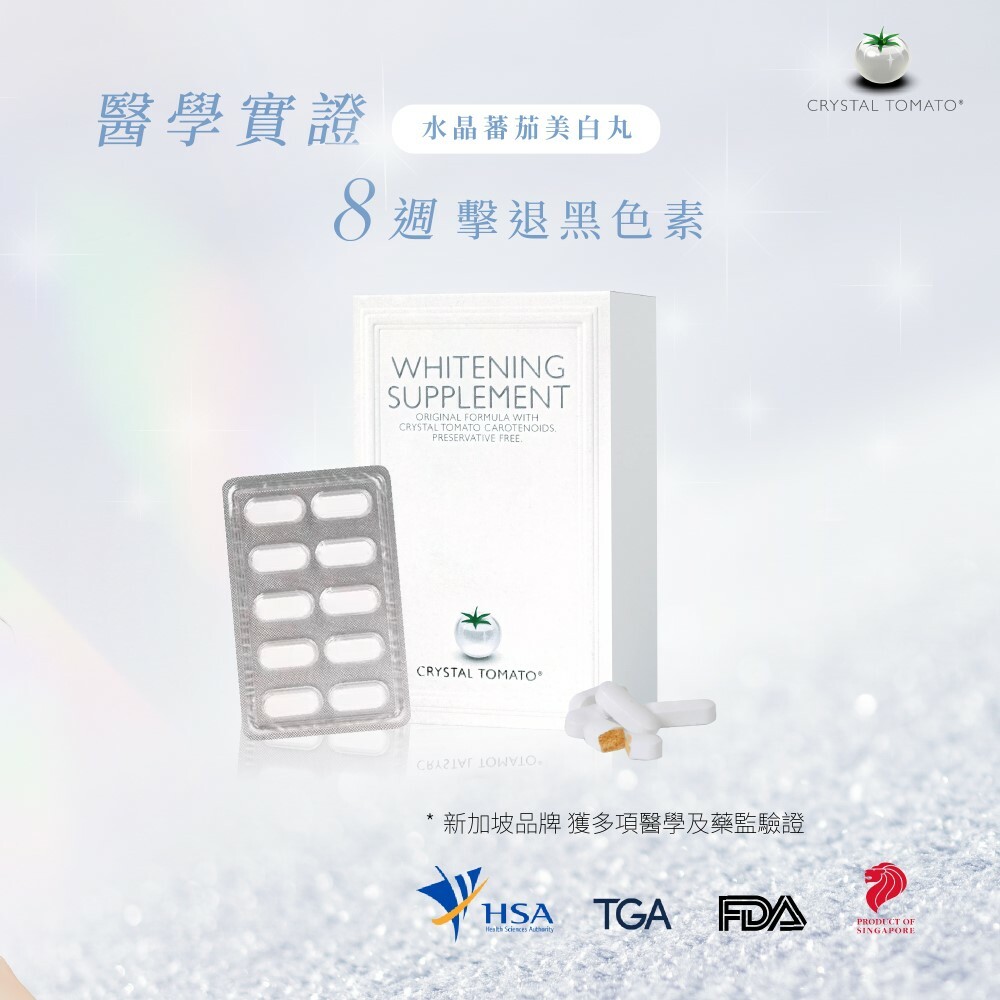 Crystal Tomato®水晶蕃茄美白丸,採用純天然、非轉基因的白蕃茄粉萃取,含有Crystal Tomato® Carotenoids (類胡蘿白素),讓每吋肌膚肌由內而外變得更白嫩,為你全身由面部至腳尖,全方位防止紫外線對肌膚的侵擾,抑制黑色素形成之餘,更減少於細胞的黑色素,為肌膚打開天然抗氧化的屏障。