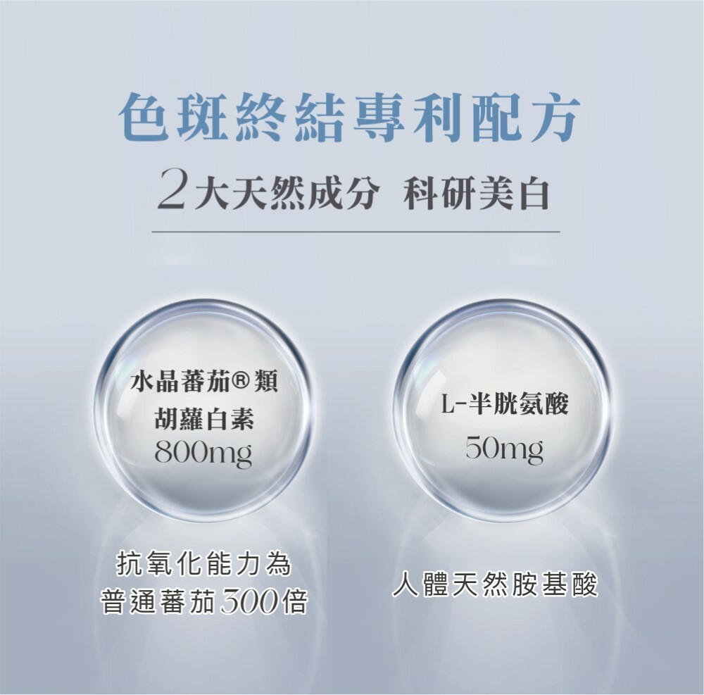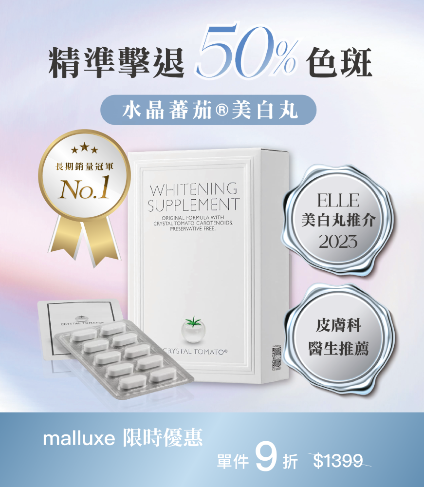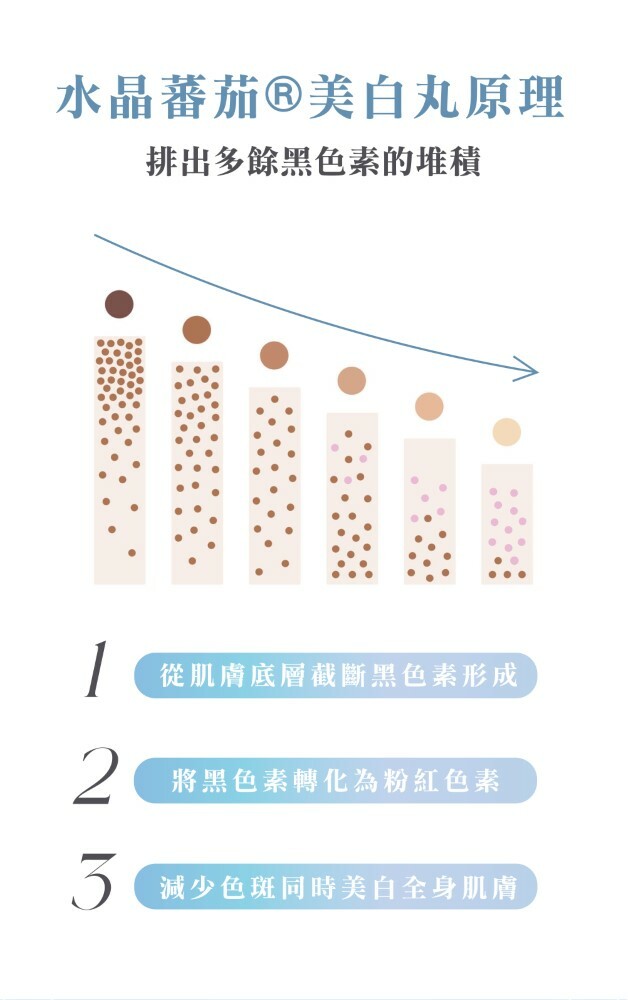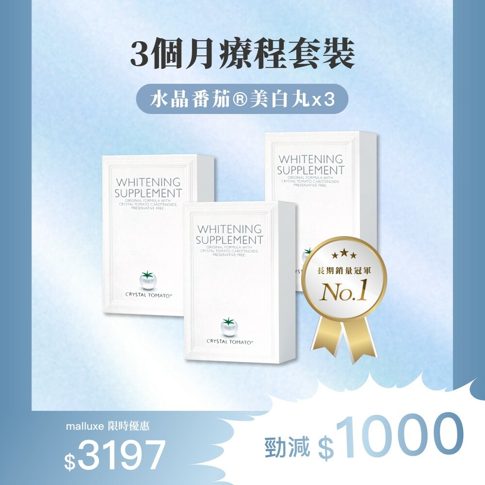 Crystal Tomato®水晶蕃茄美白丸,採用純天然、非轉基因的白蕃茄粉萃取,含有Crystal Tomato® Carotenoids (類胡蘿白素),讓每吋肌膚肌由內而外變得更白嫩,為你全身由面部至腳尖,全方位防止紫外線對肌膚的侵擾,抑制黑色素形成之餘,更減少於細胞的黑色素,為肌膚打開天然抗氧化的屏障。