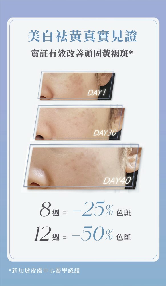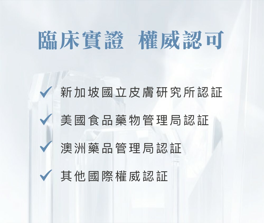 新加坡國立皮膚研究中心研發及驗證,安全可靠。獲多份國際權威認證,包括美國FDA﹑澳洲衛生局 (TGA)﹑日本JHM 醫療保健月刊、色斑失調期刊及MIMS醫學刊等等。