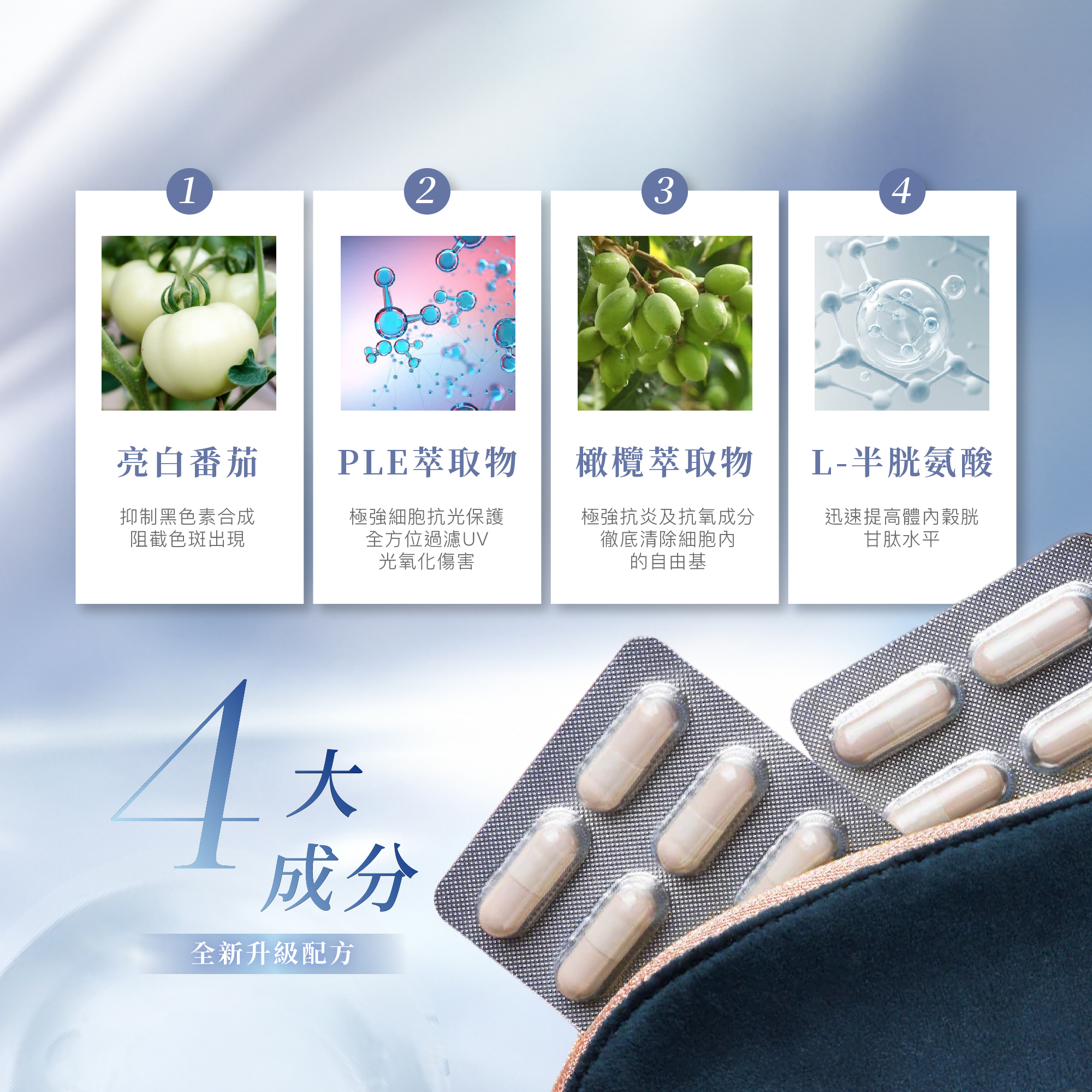 額外添加橄欖萃取物及L-半胱氨酸,迅速提高體內穀胱甘肽水平,加快細胞褪黑速度及抗氧反應, 粉碎現有色素瑕疵,打造零黑亮白肌膚。產品採用藥品級膠囊儲存技術,完美隔絕空氣及水份, 免卻氧化物破壞,以確保其美白成分的穩定性及保鮮度,達致最佳美白效果。