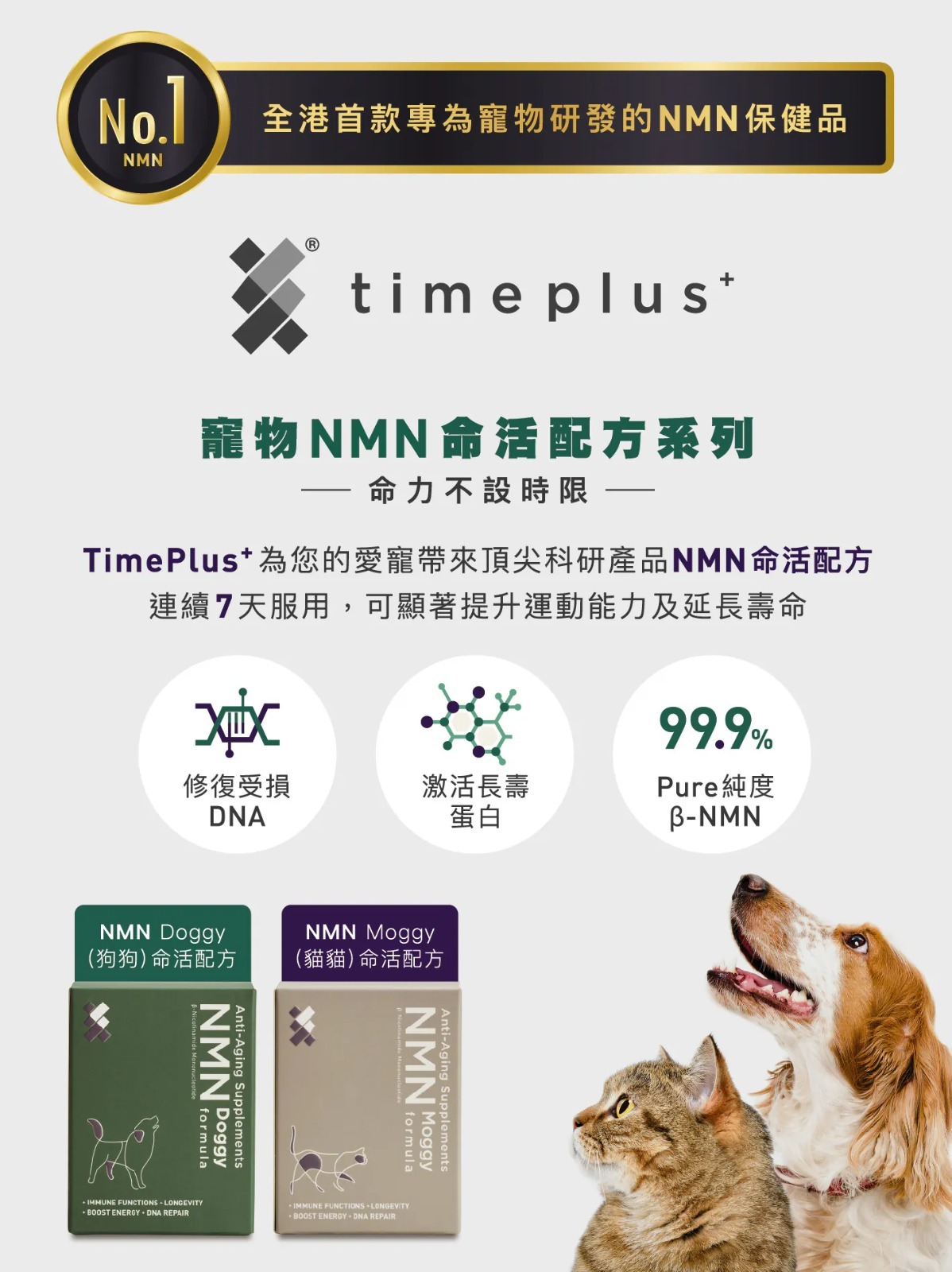 配合TimePlus+ 99.9%高純度NMN配方,美國哈佛大學動物測試顯示,連續7天服用NMN,可顯著提升運動能力、增強毛孩活力健康,提升命力。